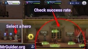 ミッションでは、全ヒーローのうち 1 人を次の部屋に送ることができます。役割の要件に基づいて、賢明に選択する必要があります。例えば;次の部屋には、機械的なオブジェクト、ロックピック、トラップがあります。この状況では、武装解除の役割を持つヒーローを選択する必要があります。 ヒーローを選択して、失敗率と成功率を確認するだけです。それに応じて行動してください。
