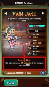 カンフークリッカーゲームでは、すべてのマスターが独自のスキルを持っています。例えば; Vain Jane は格闘技のトレーナーであり、彼女を部屋に配置すると、彼女にはスキルがあるため、より多くのお金を稼ぐことができます (レベル 5 で +300%)。かなり金持ち。あなたが最もお金を稼いでいる部屋に彼女を割り当てると、より多くの利益が得られます.アップグレードすると、ステータスとスキルパワーが向上します。同様に、レイ・ユミは自分の部屋でタップダメージを増加させることができます.マスターのスキルを確認するには、マスターメニュー → マスターアイコンをタップ → マスターカードの詳細の下にあるスキル情報を確認できます。つまり、スキルに基づいてマスターを割り当てます。