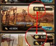 まずは帝国議会へ。ゲームのリーバイス セクションに向かいます。これらのリソース名の横にある 3 つの小さなアイコンを見ましたか?富、兵士、そして穀物?次に、メイン画面に戻り、Viziers メニューに移動します。 vizier をタップします。詳細タブを見てみましょう。そこにそれらのアイコンが表示されます。彼らは何ですか?