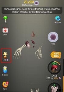 このゲームの基本的なゲーム内通貨はセルです。画面の上部中央に、毎秒生成されるセルの数が表示されます。画面の右上にある DNA ボタン (更新 - 現在はセル ボタン) をタップしてセルを作成することもできます。人体のさまざまな部分/臓器を発見するには、細胞が必要です。画面の下部には、サポート、臓器、コントロール センター、保護の 5 つのタブがあります。