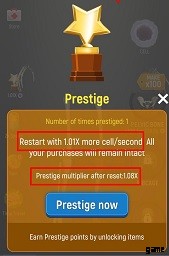 Idle Human ゲームのプレステージ機能は、ゲームの進行状況をリセットします。たとえば、男性モデルの進歩、女性モデルの進歩、サイボーグ モデルの進歩などです。ゲームの左中央で、プレステージ オプション (トロフィー) をタップします -> そこでプレステージ ポイントを確認できます。たとえば、次のように言う場合。 1.07 倍のセル/秒で再起動すると、0.7 ポイントを獲得したことになります。また、威信を実行した後は、通常の速度でセルを取得している現在の時間と比較して、1.07x セル/秒を獲得できます。 1.00%。