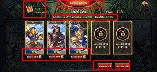 名簿メニューの上部中央に、ゲームは合計スコア、パワー、およびバフ/ボーナス効果を表示します。たとえば、すべての城ユニットの攻撃。 +12%、ヘルス 12%。