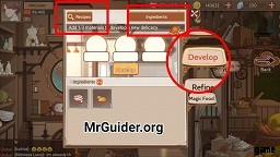 レストラン画面に移動し、研究ボタンをタップします。これらのタブを含む新しいウィンドウが開きます。魔法の食べ物を改善、開発、洗練、および魔法の食べ物。開発タブに行き、材料を選択します。ゲームをプレイすることで食材を入手できます。