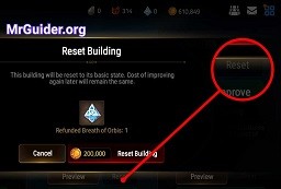 ブレス オブ オルビスを使用してエピック セブン サンクチュアリの建物をレベルアップした場合、コインを使用してリセットできます。また、ブレス オブ オービスをインベントリに戻すこともできます。建物を改善する側に向かいます -> リセット ボタンをタップします -> ゴールド コインを使ってブレス オブ オルビスを取り戻します。