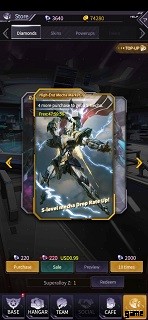 事前登録報酬を受け取ると、チュートリアルは終了します。ストアに移動 -> ハイエンド メカ - このバナーは、SSS/SS/S/A ランクのメカを提供します。 SSS のドロップ率は 3%、SS のドロップ率は 3% です。 S ランクの場合は 4% です。そして、Aランクは90%。過去の 5 つ星アップグレードに重複する必要がないため、A ランクのメカも優れています。一方、S+ランクのメカ(ほとんど)は複製が必要になります。そのため、それらをアップグレードするのは難しいでしょう – それが A グレードのメカが (開始時に) 価値がある理由です – 重複することなく簡単にアップグレードできます.