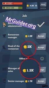 手動でコースを開始し、ドレスを着て、関係を構築し、家、食べ物、車を購入する必要はありません。あなたの仕事はこれらのことを決定します。まず、ジョブメニューに移動し、次のジョブ要件を確認します。これらの要件を満たして、次の仕事に昇進してください。一方、最初からカジノ、株、高価なドレスにお金を使っていたら、長続きしません。