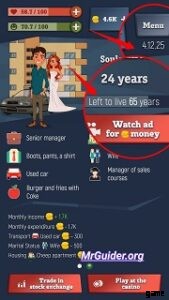 ゲームでは 1 日 1 秒が過ぎていきます。メニューボタンのすぐ下の右上隅で、日付/月/年を確認できます。そして、あなたの年齢のすぐ下で、あと何年生きられるかを確認できます。ゲームをクリアするには、この寿命内に大統領にならなければなりません。ただし、状況が悪化すると、キャラクターは首を吊ってしまいます。ゲームでお金を稼ぐ方法は 4 つあります。仕事から(あなたは月給を得る)、ビデオ広告を見て、カジノをプレイし、証券取引所で取引し、カジノ、ビデオ広告を見て、取引はオプションの選択肢です.主な収入源は良い仕事であるべきです。