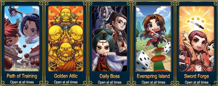 左から順に、「修行の道」 です。 経験値ペレットを獲得 、「黄金の屋根裏部屋」 大量のコインが得られます 、「デイリー ボス」 ランダムなヒーローのかけらとゴールドを獲得 、「エバースプリング島」 チェストにランダムな戦利品を与えます 最後に「ソード フォージ」 クエンチング ストーンを獲得できる場所 武器のアップグレード用。