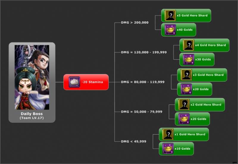 デイリー ボス チーム レベルがレベル 17 に達すると、ミッションのロックが解除されてプレイできるようになります . ダメージ量に応じた報酬が受け取れます 上の画像のようにボスに与えました。