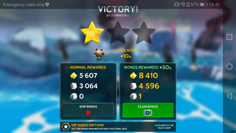 スリル満点の戦闘が終わるたびに、ボーナス報酬の広告ビデオを視聴するかどうかを選択するオプションが表示されます。これにより、50% のゴールド、砂糖、真珠 (おそらく 1 つまたは 2 つ) が最終報酬に追加されます。