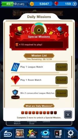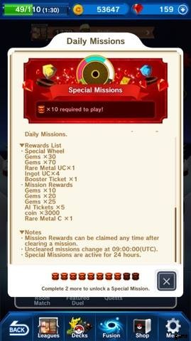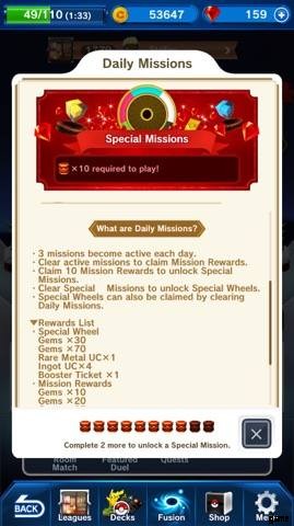 デイリー ミッションを完了する ポケモン デュエル ジェムを獲得できます .これらのデイリー ミッションには、一連の % のジェムが含まれており、24 時間ごとに更新されます . 3 つのミッションがあります 毎日。 10 個のミッションを完了すると、スペシャル ミッションのロックが解除されます スペシャル ホイール スピンへのアクセスを獲得できます さらに多くの宝石を獲得するチャンスがあります。