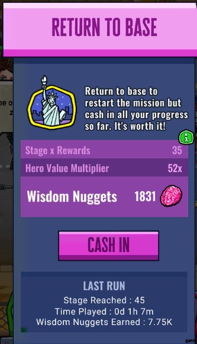 ゲームの複数のウェーブを進行するのに時間がかかり、早くもニューヨーク レベルでは、次のステージに進むために 50 のステージをクリアする必要があります。この数は、フィラデルフィアとリッチモンドではすぐに 100、150 になります。ピッツバーグ。時々、そのマイルストーンに到達するのに非常に近づいていますが、ボスが怒りメーターを蓄積してチームを全滅させる前に、時間内にボスをクリアできないようです.これがキャッシュイン機能の出番です。
