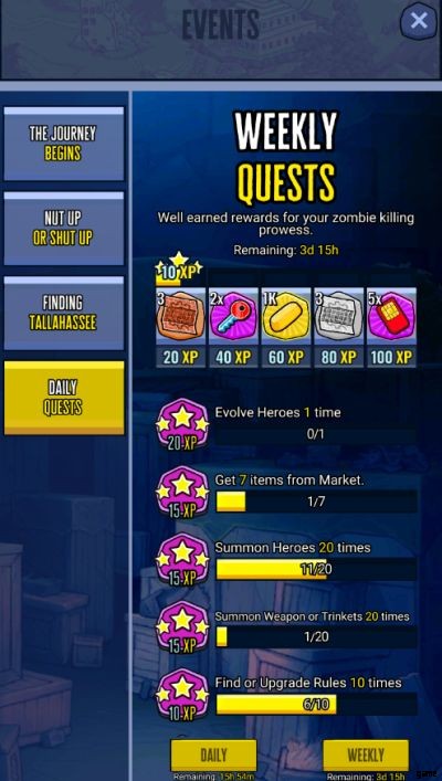 グローバル マップ画面の [イベント] タブで、デイリー クエストとウィークリー クエストを確認できます。また、ログイン報酬などの他のすべてのボーナスや、さらに多くの特典を獲得できる追加のクエストも確認できます。
