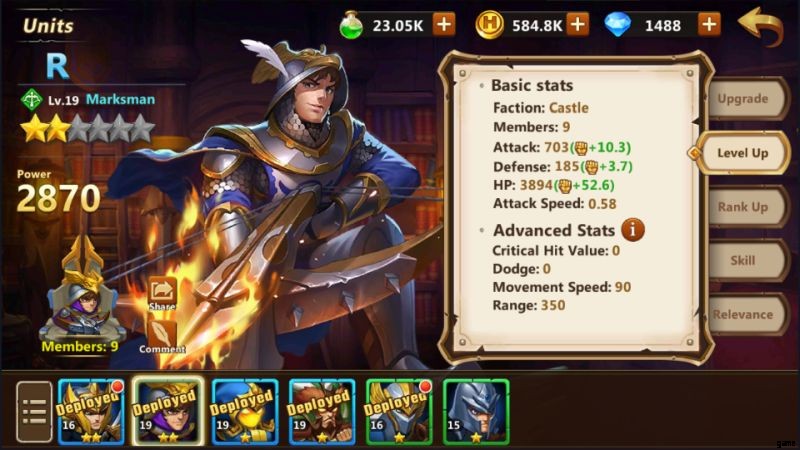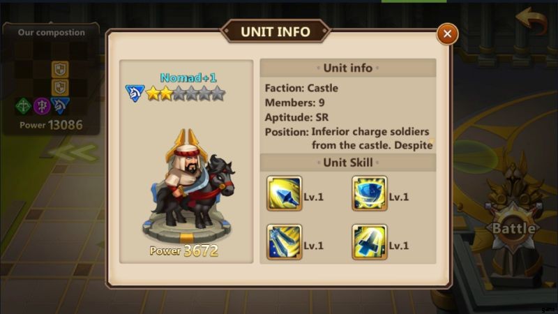 ユニットには装備に応じた色があります。ユニット全体を同じ色にアップグレードする前に、最初に 4 つの装備すべてをより強い色にアップグレードする必要があります。したがって、緑のユニットを持っている場合は、ユニットを青にランクアップする前に、まずすべての装備を青にアップグレードする必要があります。ユニットの色をアップグレードすると、追加のスキルがアンロックされます。たとえば、ブルー キャバリアは、キャバリア ユニットのクリティカル ヒットを 100% 増加させる能力であるグロリアス チャージをアンロックします。装備をアップグレードするには特定のアイテムが必要です。これらのアイテムをタップすると、入手方法が表示されます。