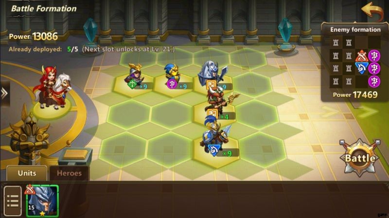 防御、突撃、攻撃ユニットは前 2 列に配置され、遠距離ユニットとキャスター ユニットは後 2 列に配置されます。遠距離ユニットは、ダメージを最大化するために最も後ろの列にとどまる必要がありますが、キャスターは最後から 2 番目の列に配置することをお勧めします。