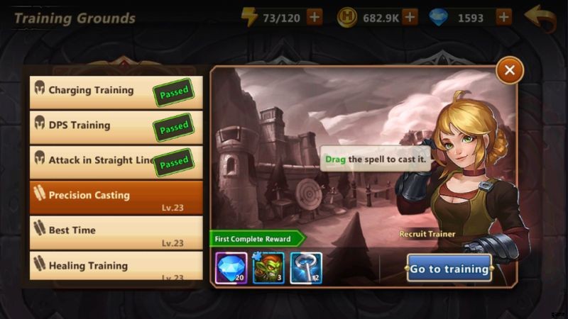 あなたの町の訓練場からアクセスできる非常によくできたチュートリアルがあります.そこから、3 つの異なるトレーニング キャンプから選択できますが、始めたばかりの場合は、基本的なトレーニング キャンプの 1 つしか利用できません。
