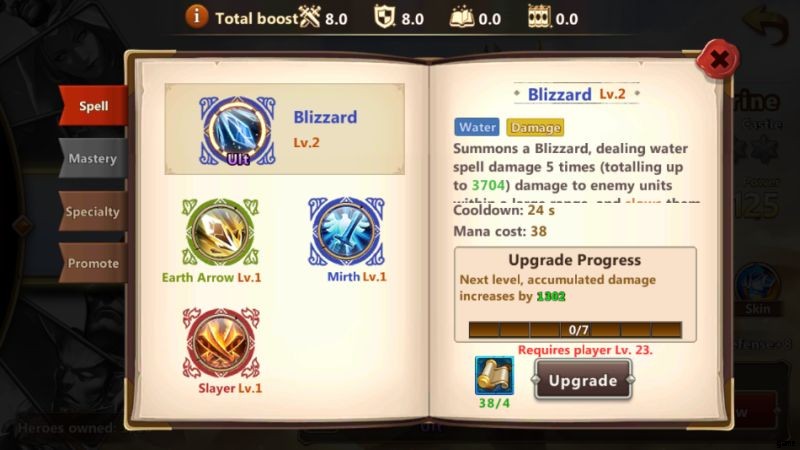 各ヒーローは 4 つの呪文にアクセスでき、アップグレードを開始するにはプレイヤー レベル 20 に到達する必要があります。呪文のアップグレードには呪文の巻物が必要です。これは、宝石を使ってエクスチェンジ ハウスで購入できます。呪文は戦闘中に唱えることができ、マナコストがあります。また、それらを狙う必要があるため、敵がグループ化したときに攻撃呪文を使用し、必要なときにいつでも味方をブーストまたは回復することで、効果を最大化するようにしてください.