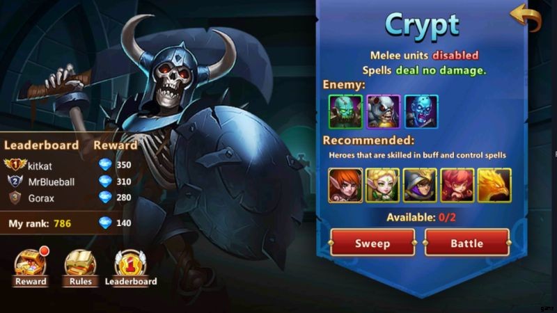 Dwarven Treasury は、近接ユニットのみでできるだけ多くの敵を倒そうとするモードで、倒した敵の数が多いほど、より多くのゴールドを獲得できます。ドワーフの宝庫には 1 日に 2 回まで入ることができます。クリプトは、できるだけ多くの敵を倒そうとするダンジョンです。遠距離ユニットのみをクリプトに連れて行くことができ、ヒールは機能しません。