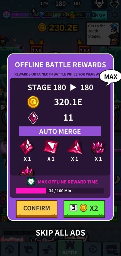 もちろん、ステージが上がるにつれてモンスターが強くなるので、ヒーローをできるだけアップグレードして、これらのより強いクリーチャーに立ち向かえるようにすることが重要です。ステージを通過するには、オフラインの場合は先に進めないため、ゲームの [バトル] タブに留まる必要があります。より高いステージに到達すると、報酬も得られます。