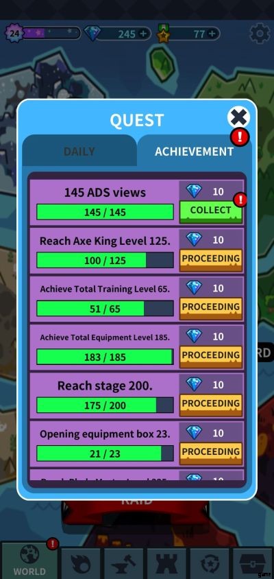 主にミッションを完了することで宝石を入手できますが、さらに多くを買いだめするには、必ず [ワールド] タブをチェックして、メイン メニューに赤い感嘆符がポップアップ表示されるたびにクエストの報酬を入手してください.さらに、ストアでは 1 日 5 回、無料で宝石を山積みすることもできます。技術的には無料です。ご想像のとおり、別の広告を見て取得する必要があります。
