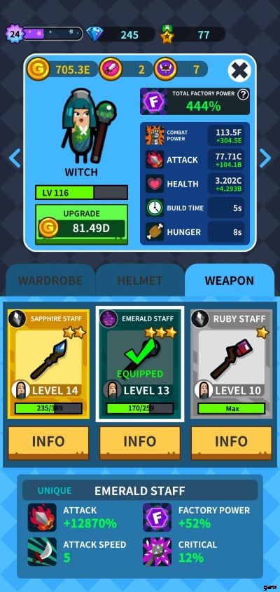 ゲームプレイに組み込む必要があるもう 1 つの必要な戦術は、[管理] タブを介してヒーローの能力を常にアップグレードすることです。ここでは、改善され、より強力なワードローブ、ヘルメット、武器を装備できます。また、ヒーローの攻撃、攻撃速度、ファクトリー パワーについて学び、装備を強化するにつれてこれらの統計値が上がることを確認できます。