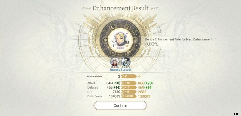 Heroes can also be enhanced by sacrificing or feeding other heroes of the same or lower star grade along with spending gold. Each hero sacrificed has a separate and distinct probability of success, which depends on the sacrifiecced hero’s star grade and element. You can enhance a hero 5 times per star grade and if the previous enhancement is a failure, the next one has a boosted success rate.