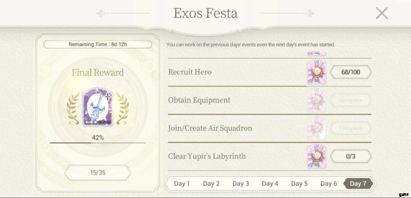 As soon as you dive into the world of Exos Heroes, The Exos Festa Event starts being active. This feature unlocks certain objectives you need to accomplish to earn Exos and other valuable rewards. The missions typically relate to the usual activities you should engage in just like the daily missions, challenge missions, and achievements. You can still accomplish missions and earn rewards for the previous days and although it is a 7-day event, you have more than 2 weeks to accomplish all feats.