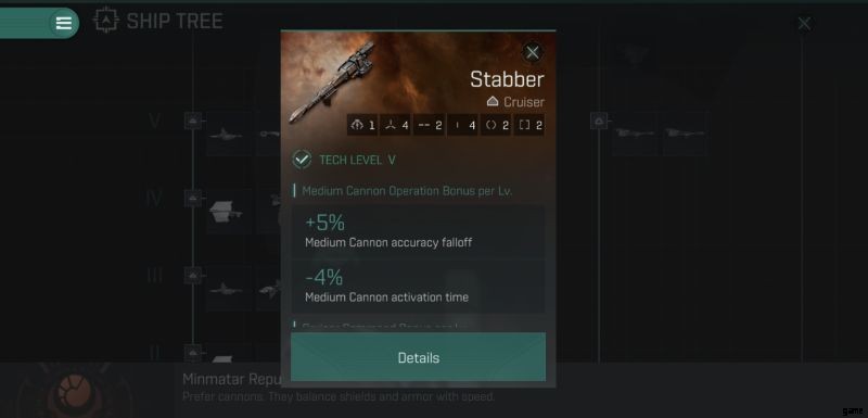 シップ ツリーで任意のシップをクリックすると、ステータス、モジュール スロット、ボーナスなどのさまざまな詳細が表示されます。まず、船のウィンドウの右上にある利用可能なスロットの数と、船から取得できるロール ボーナスやその他のボーナスを確認してください。