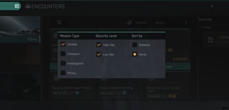 フィードに表示されるクエストの種類を区切ることもできます。ページの左上隅にあるボタンをタップして小さなウィンドウを開き、ミッションの種類をオンまたはオフにします。高セキュリティまたは低セキュリティのミッションのみを受け入れることも選択できます。もう 1 つの重要な機能は、希少性と距離に基づいてクエストを並べ替えることができることです。この機能を利用して、クエストを受ける際にもう少し選択的になるようにしてください。