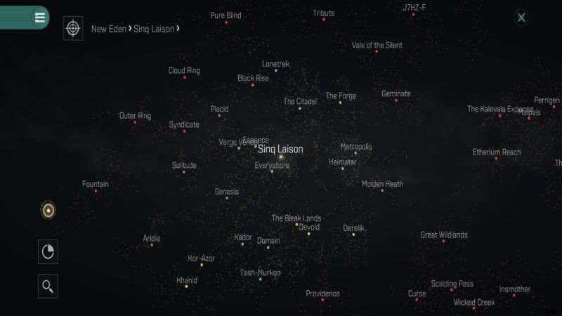 Star Map を初めて開くと、上のスクリーンショットが表示されます。お住まいの地域によって多少異なります。最も輝いているのは、あなたがいる場所です。この例では、たまたま Sing Laison エリアです。現在いるエリアをタップすると、マップが拡大され、到達できるさまざまなエリアが表示されます。また、各エリアの SEC レベルも表示されます。これにより、必要な場所のほぼどこにでも行くことができます。 EVE Echoes で多くの旅行をすることになることを覚えておいてください。