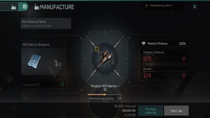 あなたの産業スキルは、リソースのコストを削減するのに役立ちます。リソースとブループリントを入手したら、[ジョブの開始] ボタンをクリックします。製造が完了したら、アイテムを収集します。製造業は確かなものであることを覚えておいてください。リバース エンジニアリングで設計図を入手するのは偶然です。試す前に可能性を確認してください。