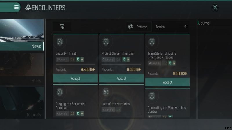 基本的に、Accept ボタンをクリックしてミッションを開始します。上のスクリーンショットの [基本] ボタンを参照してください。それをクリックすると、難易度の高いミッションに切り替わります。 Accept ボタンをタップする前に、ミッションをタップして確認してください。完了するための要件が右側に表示され、船の推奨事項が左側に表示されます。