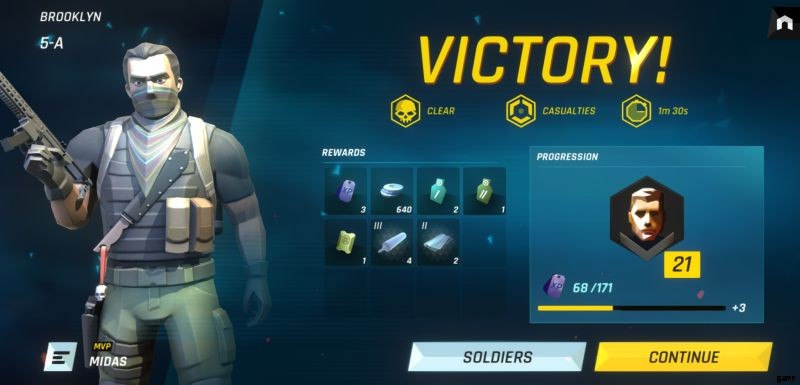 各ステージには、他のゲームの星評価と同じように機能する明確な条件があります。現在のステージをクリアした後も次のステージに進むことができますが、自動勝利オプションは、ステージで 3 つ星の勝利を確保した場合にのみ使用できます。チャプターごとに 42 個のスターをすべて獲得すると、スコット ミッチェル インテルを獲得してロックを解除できるほか、プレミアム通貨であるゴールドも獲得できます。司令官レベルの大量の XP を含む初回報酬があるため、すべてのクリア条件を確保することよりも、前進することが重要です。