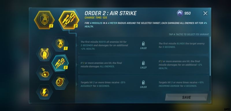 自由に使える 6 種類の戦術があり、最初は 2 種類しかありませんが、残りは新しいレベルに到達すると簡単にアンロックできます。最初のコマンドは、選択した味方ユニットに 5 秒間シールドを提供するバリアであり、ユニットのヘルスを 50% 増加させ、粘り強さを 50% 増加させます。 2 番目の戦術は、敵に AoE ダメージを与える空爆です。空爆は 4 つのミサイルを発射し、ヒットごとに敵のヘルスの 4% にダメージを与えることができます。半径はターゲットの周囲 4 メートルです。
