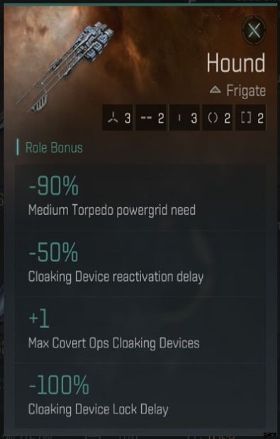 ハウンドは秘密工作船です。その上に隠密作戦クローキング装置を置くことができます。これは、どの速度でもクロークされたままであることを意味します。クローク中にターゲットをロックすることもできます。