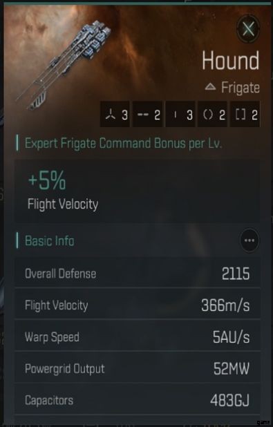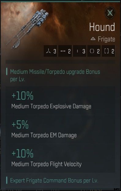 次の EVE Echoes サンプル船は Hound です。これは、別の奇妙なものの 1 つです。はい、フリゲートです。はい、中型武器 (具体的には中型魚雷) を搭載できます。いいえ、Minmatar でない限り気にしないでください (役割ボーナスに注意してください)。また、オメガ クローンを使用していない限り、気にしないでください。