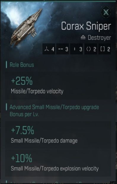 この場合、あなたが Caldari である場合、Corax Sniper は Role Bonus を獲得します。スナイパー船の楽しいところは、現在プレイ可能な役割ごとに 1 つずつあることです。 4 個の小型ミサイル ランチャーのセットは、ロール ボーナス速度ブーストを使用してターゲットをより速く撃ちます。ミサイルは、カイティングと引きずる戦術に生得的です。