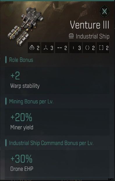 ロール ボーナスは、ワープ ディスラプターを使用して攻撃者から逃れるのに役立ちます。これはたまたまOREです。 Venture II に比べて Mining Bonus が低いことに気付くでしょう。採掘レーザーが 3 つあるので問題ありません。