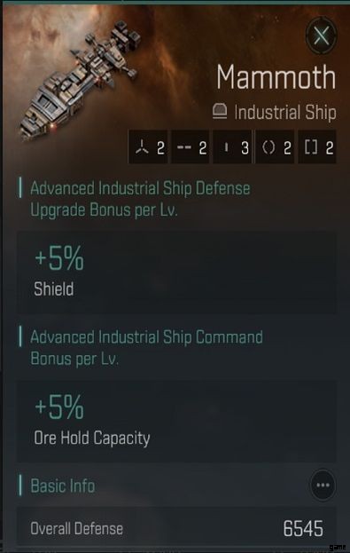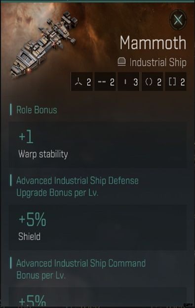 Advanced Industrial Ship Command をアップグレードすると、Mammoth は大きな Ore Hold も提供します (最大 21,250 立方メートル)。これらのアップグレードの奇妙な部分は、ブーストを確認するために貨物と鉱石のホールドを手動で確認する必要があることです.また、彼らが機能するためには、アクティブな船である必要があります。船の情報が正しく表示されません。