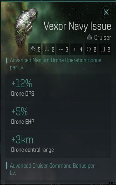 次の EVE Echoes Cruiser の例は、Vexor Navy Issue (VNI) です。これは、ドローンボートを使用する上で非常に優れた方法です。ドローンのスキルを訓練している限りです。