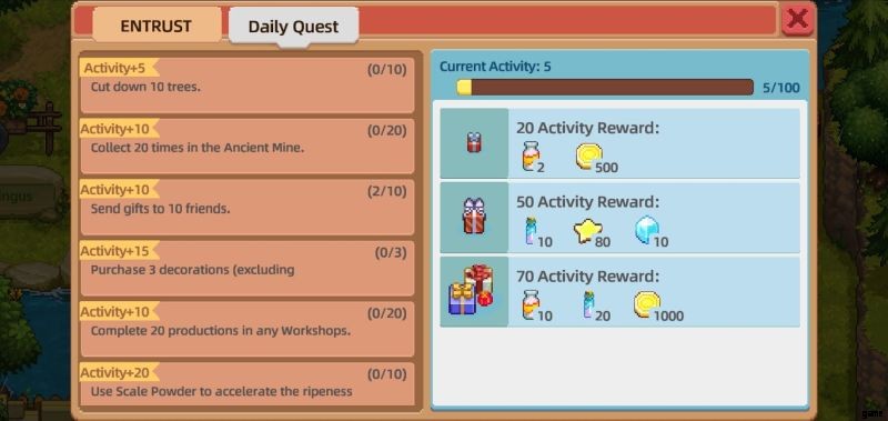 Last but not least, check the Daily Quest. Every day, you’ll be able to redeem consistent rewards by playing the game and hitting certain milestones, like for example, cutting down 10 trees. Visit the Daily Quest tab in Quests to see what needs to be doing, and follow the instructions. Whenever you notice a red dot on it, it means there are new rewards available to grab.