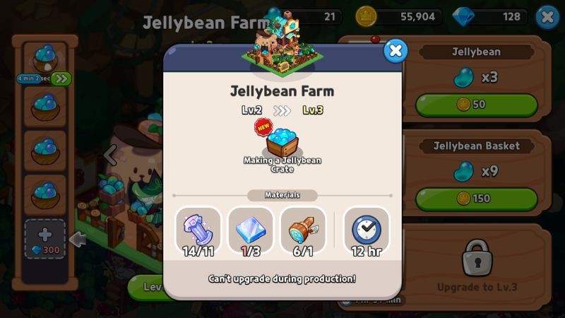例として、ジェリービーン ファームを見てみましょう。レベル1の建設オプションでジェリービーンを3つ作るのに1分かかります。 lv2 建設オプションで 9 つのジェリービーンズを作るのに 11 分 53 秒かかります (Tick Tock Clock Tower をいくつかアップグレードした場合)。