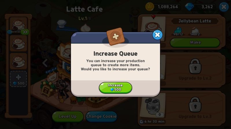 明らかに、この数学はひどいです! 9個のジェリービーンズを作るのに3分しかかからないはずですよね?ええと、lv2 構築オプションは 9 つの Bean に対して 1 つのキュー スペースしか占有しないため、これと lv3 アップグレードは 1 つのことに非常に役立ちます。それは、不在時の備蓄です。