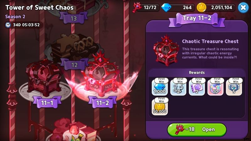 一部のタワーフロアは 2 つの戦闘に分かれます。今すぐ両方を終わらせたくなるかもしれませんが、派手な戦利品と高い主要価格でチェストフロアにたどり着くために、それらを急いで通り過ぎたほうがよいでしょう.そうすれば、チェストに遭遇して開くための鍵がなく、待って立ち往生するのではなく、すぐにチェストを開くことができます.クッキーがまだ十分に強くないレベルに達した場合は、見逃したフロア スプリットに戻ることができます。