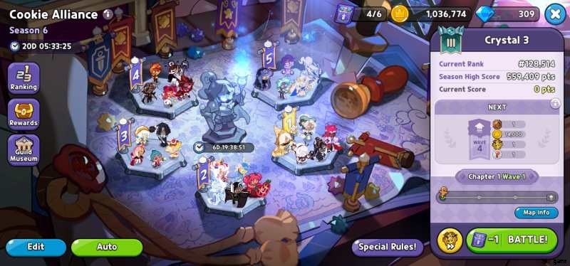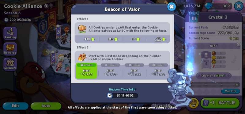 クッキーの 5 つのチームを設定し、彼らは 60 ウェーブに及ぶガントレットを実行しますが、ウェーブ 4 を破ることはギルドの遺物を取得するために必要な最小要件であり、そのうち 1 つしか取得できません (別の同盟をフォークする場合は 2 つ)ただし、タイム ジャンパーや EXP スター ゼリーなどの他の報酬は、通過する波が多いほど増加します。