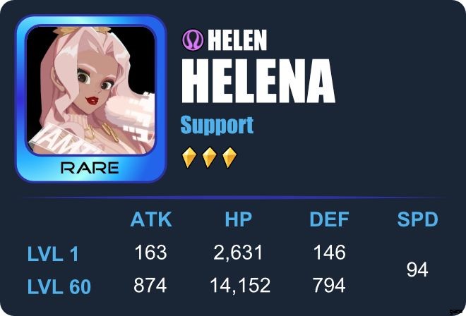 Helena’s best skill is Whispered Blessing which can heal one chosen ally up to 30% of their max HP while the rest of your allies get 15% of their max HP healed. Once upgraded in Ascension, it can grant all allies C. RATE Up which can benefit a lot of Fighters, especially ones that have high C. DMG. Since her ATK is pretty low, this skill balances that out and makes her two other damage skills, which dispels an enemy’s buff and reduces an enemy’s AP, deal more damage.