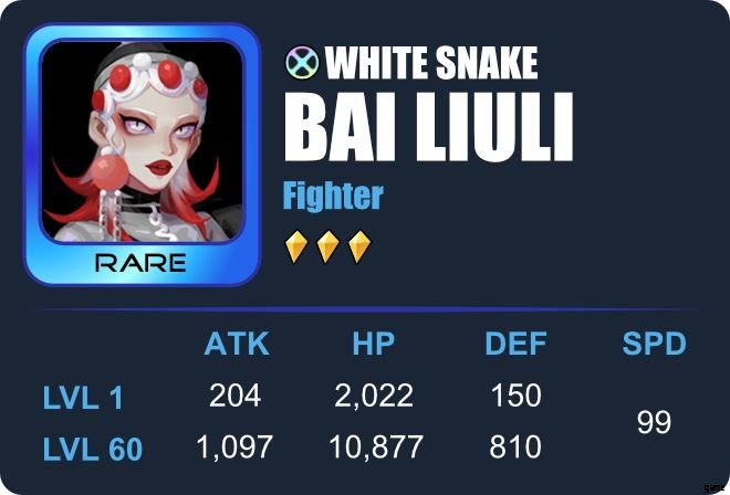 Bai Liuli is a Fighter-Support combo that can not only deliver blows with debuffs such as Silence and Sear, but can also dispel debuffs inflicted on her and steal her target’s buffs. Her skills make her a good counter against enemies that are reliant on buffs and debuffs while also dishing out her own debuffs. Being able to restore her allies’ health at the beginning of her turn with her high SPD of 99 makes her a fairly good minor healer but cannot completely take the place of other more effective Healers. Her third skill, Incorporeal, works like an AoE when against 5 enemies but a chain attack when there are lesser targets.
