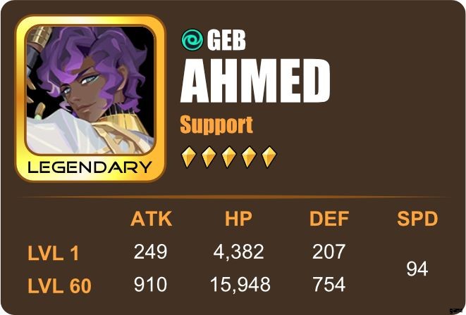 Effects | — | Ahmed’s heals always target Lowest HP Allies first If target has HP Ceiling Penalty =Restore target’s HP threshold by 5% + Remove Diseased debuffs + Supporting Song (1 stack) (max:25) | Reduce Cooldowns by 1 turn Skill is not affected by cooldown buffs / debuffs |