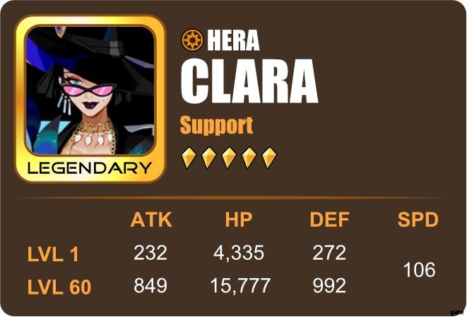 Damage / Heal | Damage:2 hits, 110% (max lvl) of ATK total Heal:5% of Clara’s max HP (Allies) | — | Heal:35% max HP |