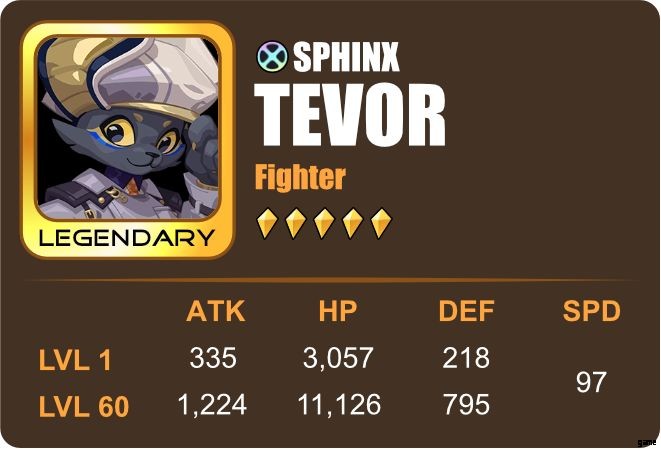 Tevor’s skills revolve around his unique buff, Neko-Sense, and debuff, Neko-Curse. Neko-Sense resets all ability cooldowns and attacks a target twice the next turn once he has two stacked. Each stack reduces damage taken by 15% and will reset once activated. Neko-Curse deals 40% of Tevor’s ATK as True Damage to all enemies once the carrier dies. This debuff stacks up to 5 and increases the multiplier by 40% each.